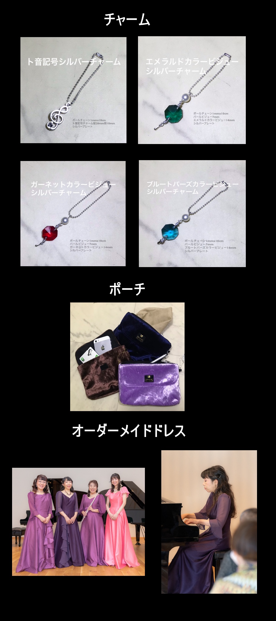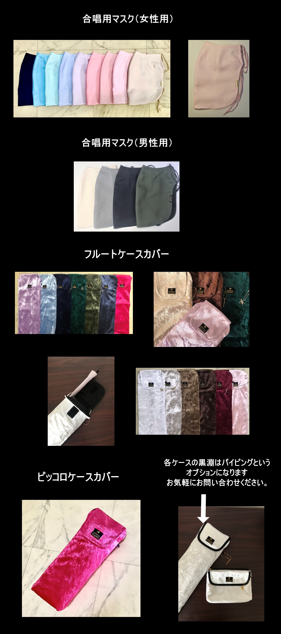 取り扱い商品 ・独唱用・合唱用マスク ・フルートケースカバー ・ピッコロケースカバー ・プチバックポーチ ・チャーム ・オーダーメイドドレス 等の小物販売を行っています。 金額はすべて税込み表示です。